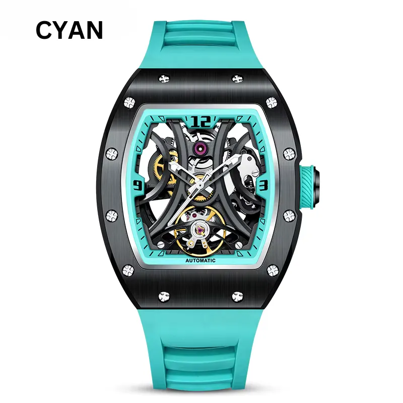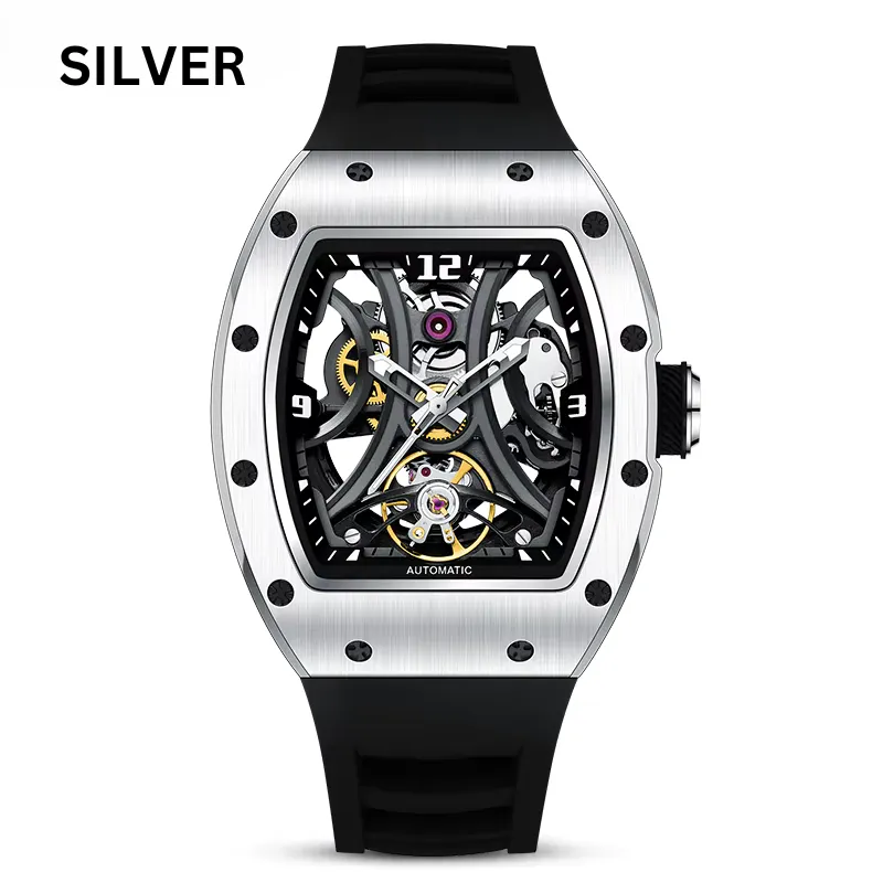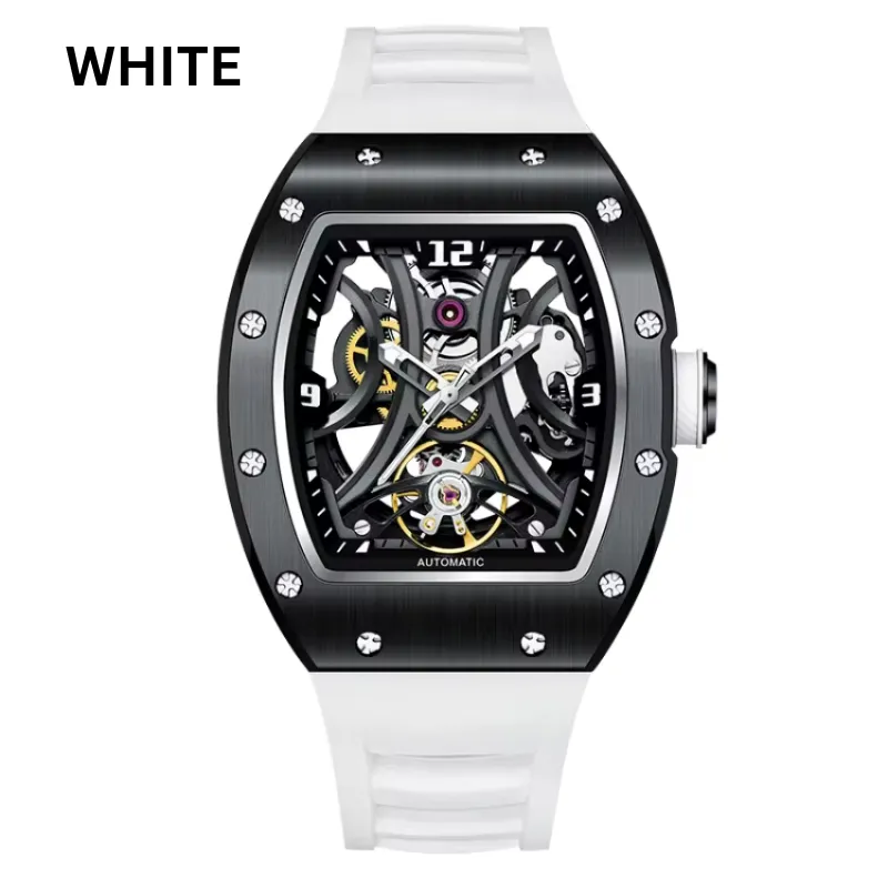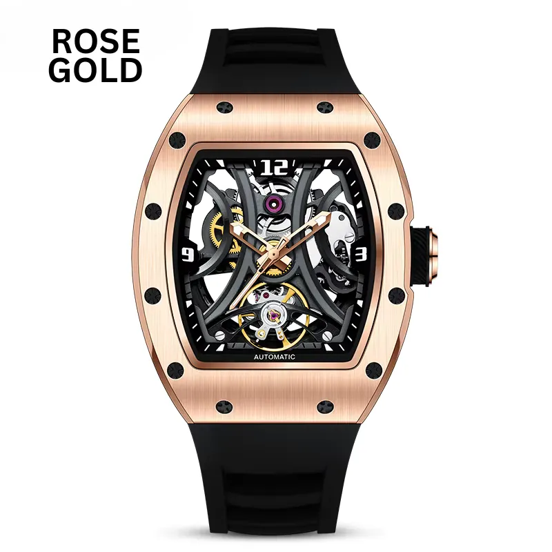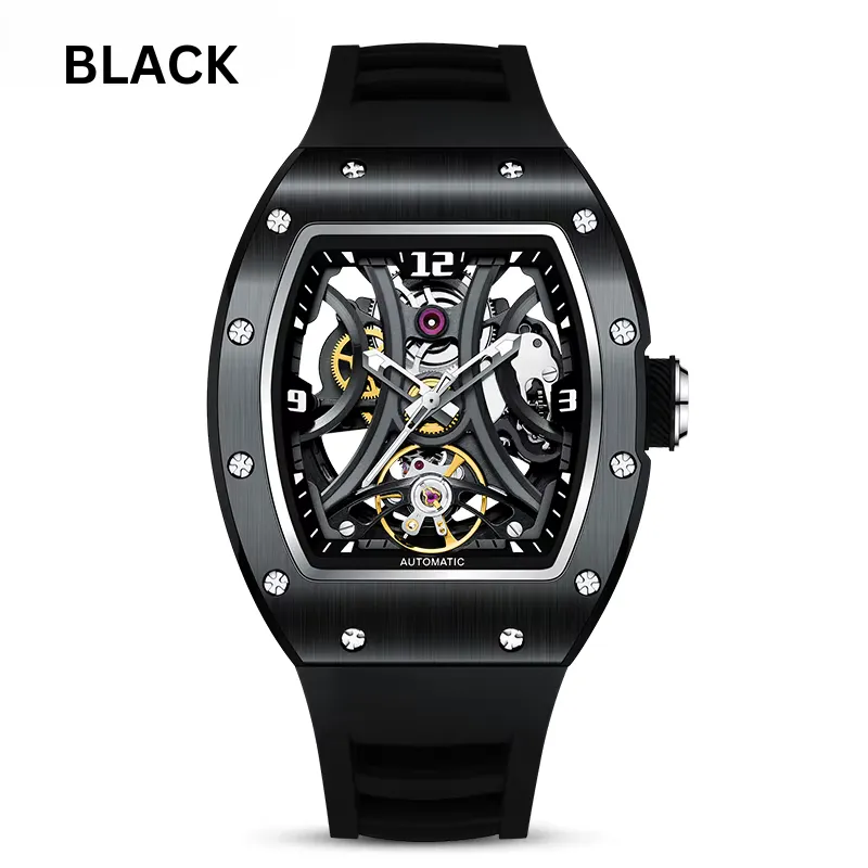 Featuring an open-heart skeleton dial, this watch reveals the intricate movement within, combining mechanical artistry with a luxury-inspired tonneau case design. Crafted with premium stainless steel, curved crystal, and a transparent exhibition caseback, this model is as functional as it is statement-making.