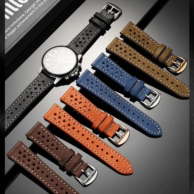 Retro-inspired rally racing perforated leather watch strap with contrast stitching. Breathable, durable, and perfect for both vintage chronographs and modern sport watches.