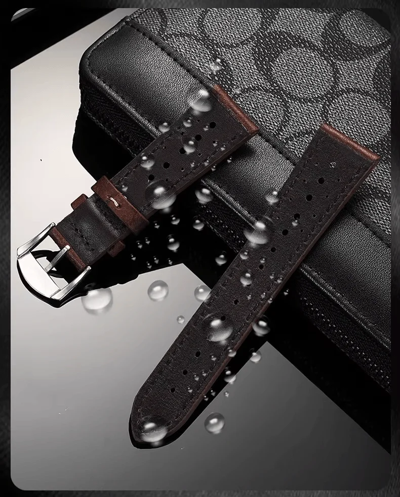 Crafted from premium full-grain leather, this strap features rally-style perforations for maximum breathability and an authentic racing aesthetic. The contrast stitching adds sporty elegance, while the supple leather ensures unmatched comfort and flexibility.